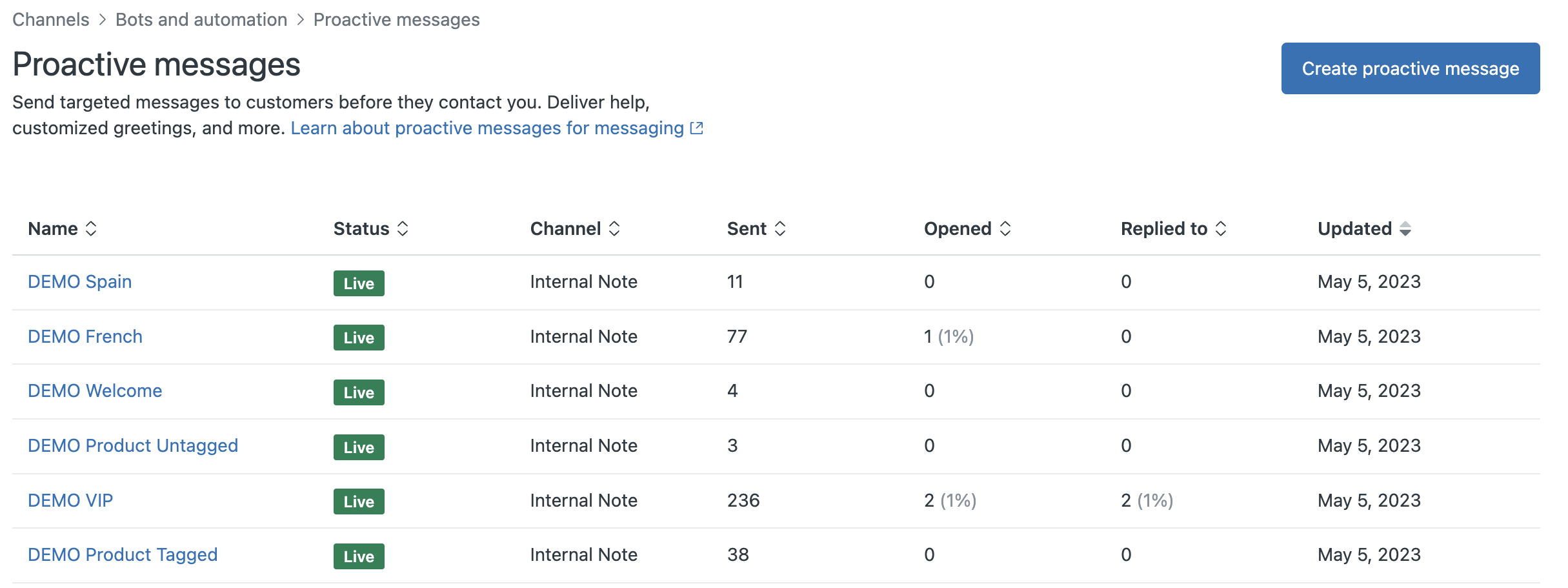 Similarly, a way to create, update, (dis)able or delete proactive messages via API would make it possible for tools like Hubspot to schedule and deploy campaigns automatically.