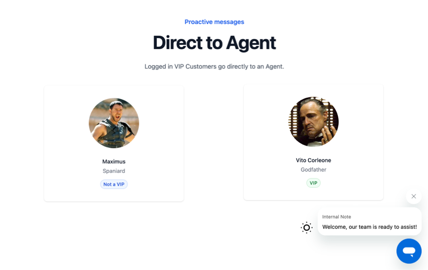 Our webmaster made it so that whenever a VIP user logs in we get a unique hash added to the URL #vip. We can now setup a rule that checks for the hash in the URL and immediately shows a proactive message that will contact the VIP Customer to an Agent, instead of the Chatbot.