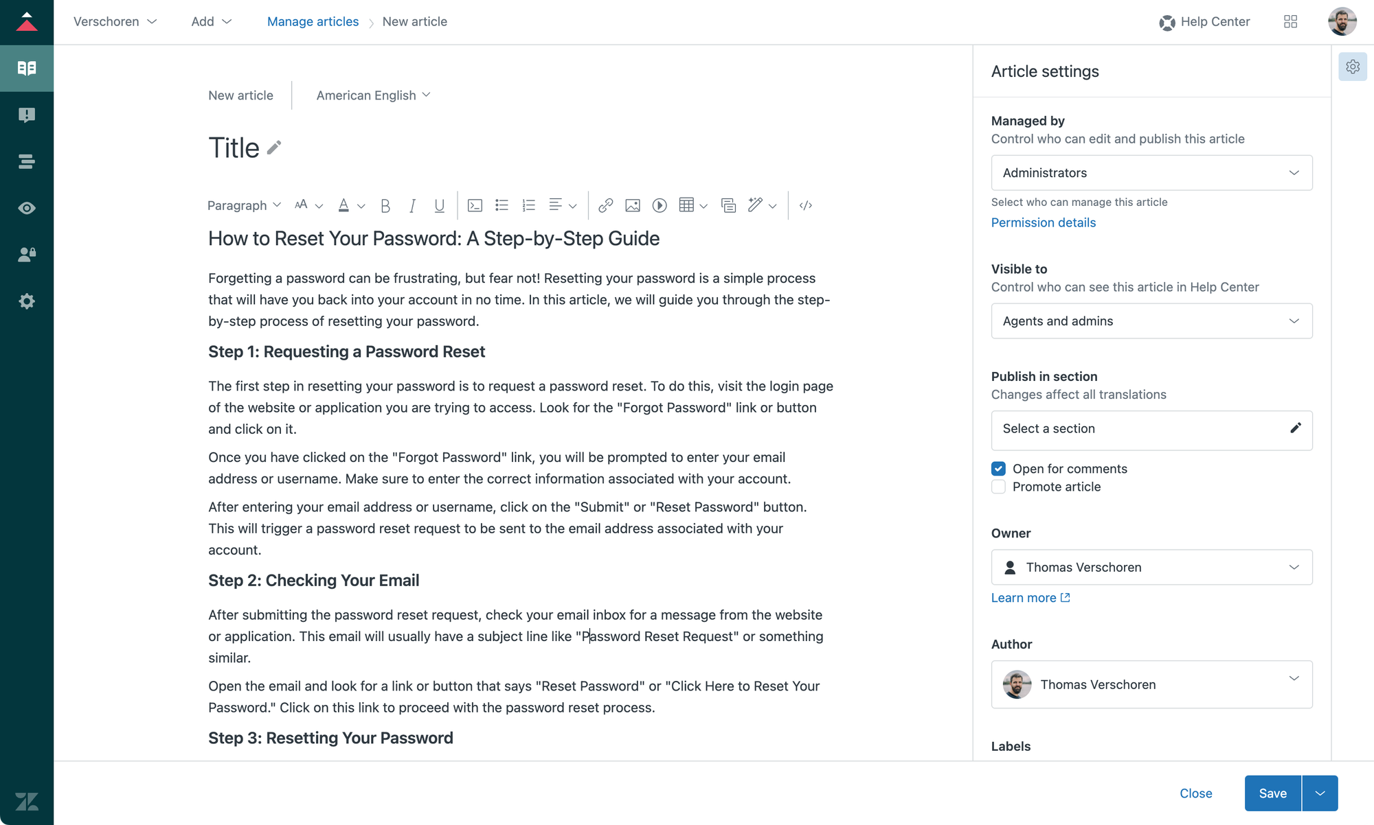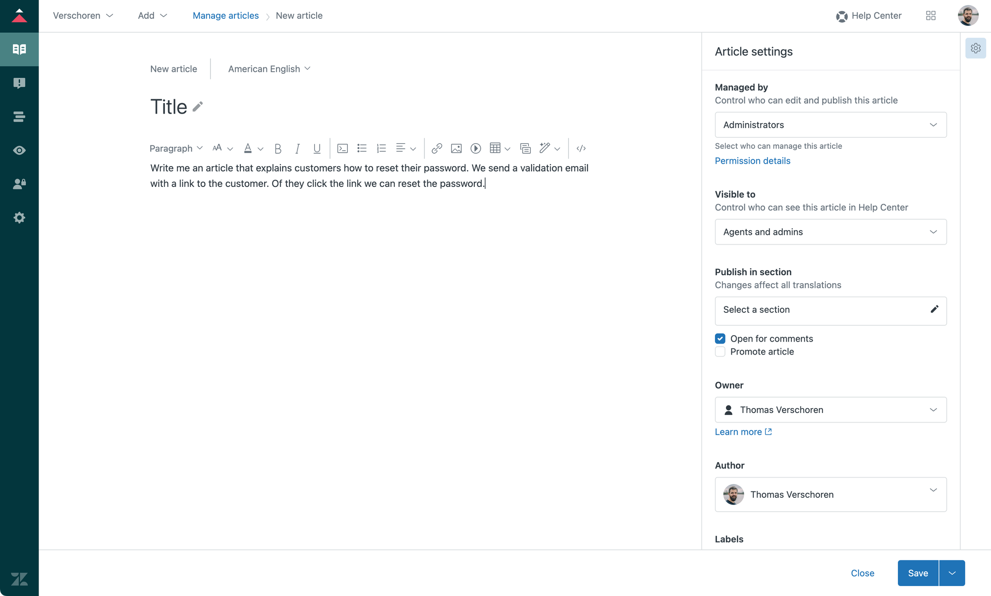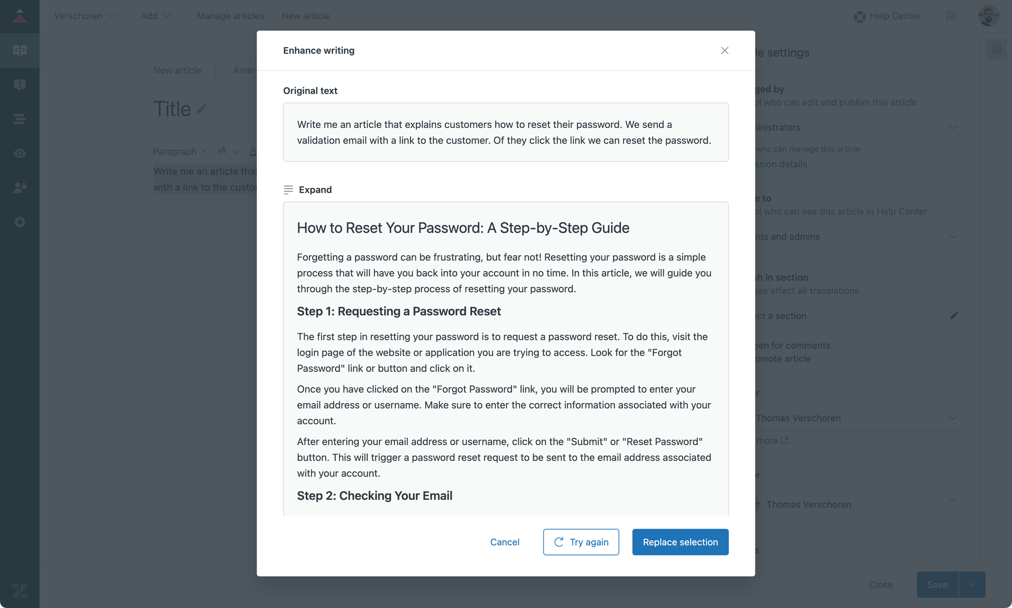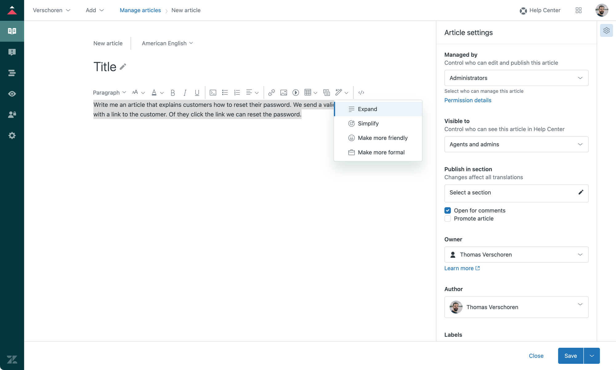 The new Generative AI for the Help Center has a new hidden prompt feature. You can write down your article idea in a single sentence, and use the Expand feature to create a full article for you.