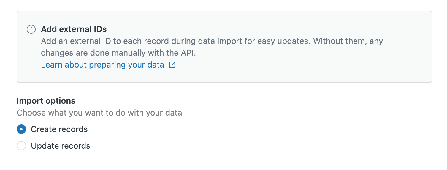Since the API now allows for bulk actions on custom objects, the data importer got an update too. You can now not only bulk import organisations or custom objects, but we can now also update exiting records during the import. Just make sure your objects have unique and stable external ids.