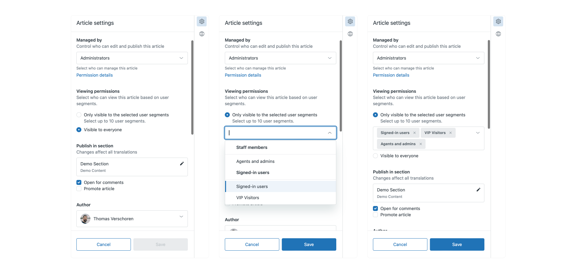 One of the main limitations in segmented articles for the Help Center was that you could only assign one segment per article. This lead to scenarios where if you want to make some articles available to Organization A and Organization B, and others to only A or B, you'd end up with three segments: