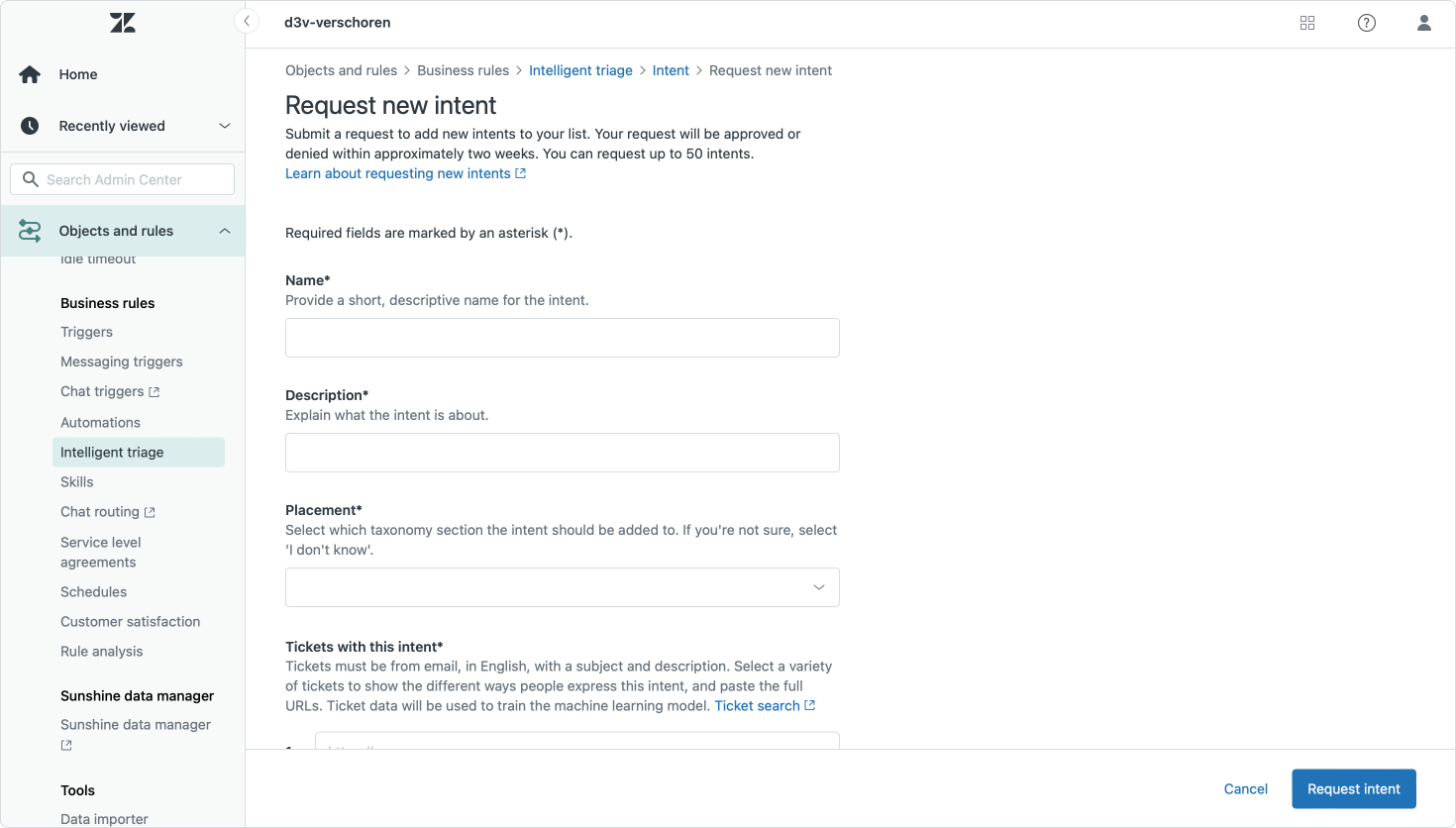 To solve this issue, Zendesk allows customers to request new intents. Customers can fill in a request form with an intent description and sample tickets. Once approved (or if approved..) the intent gets added to all Zendesk customers' setups.