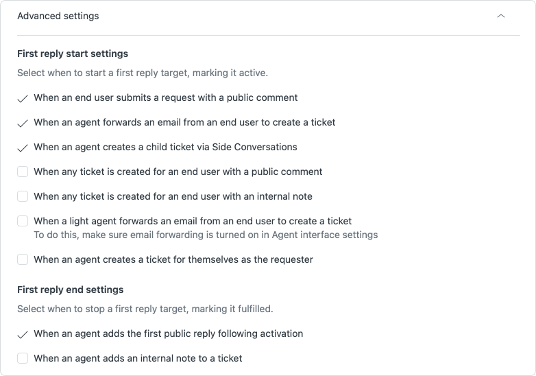 Previously a first reply time would only exist if there wasn't a first public comment to a customer. Now, with the new advance options we can start or ignore the first reply time SLA even when tickets are created with internal notes, or created by light agents.