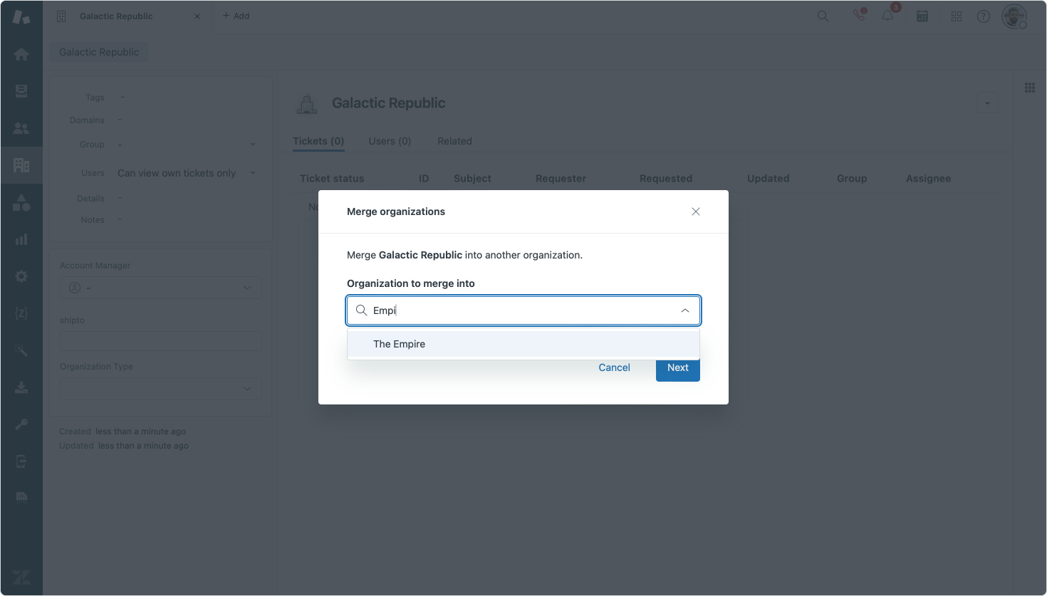 When organizations are merged, all users, tickets and domains are merged into one organization.