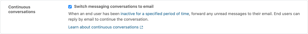 With Continuous conversations Zendesk will send out your agents' last messages over email to the customer, allowing customers to continue the conversation via email, or switch back to the widget at their convenience. This feature used to auto-trigger after 10 minutes of inactivity, but will now fire once a conversations becomes inactive, which could be less than that time. It's a small change, but seems more logical than a set timeframe?
