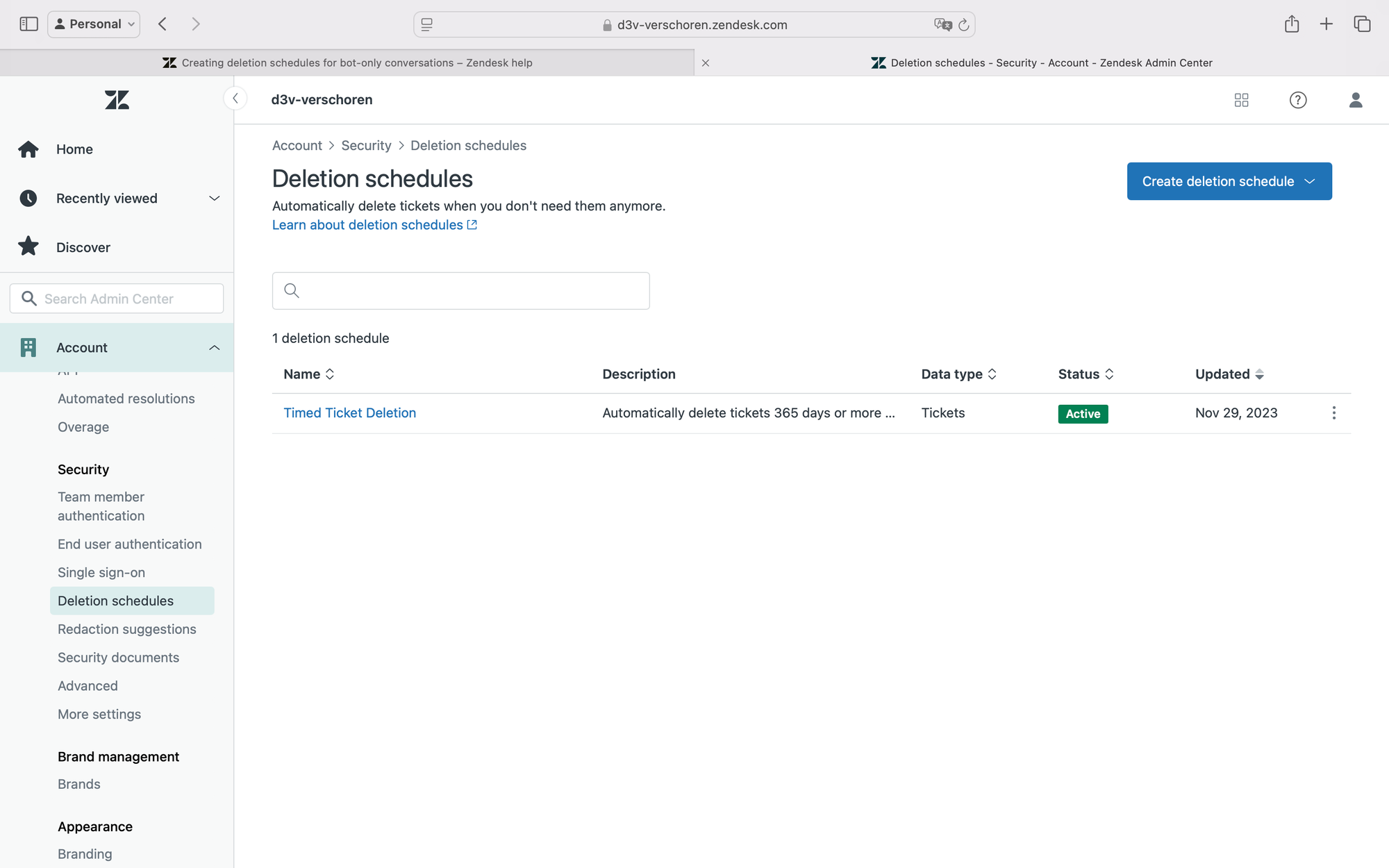 As mentioned, each Zendesk setup gets one deletion schedule. If you want more schedules, which allow for more complex rule sets, you can purchase the Advanced Data Privacy and Protection add-on, which among a big set of additional security features, allows for multiple rule sets.