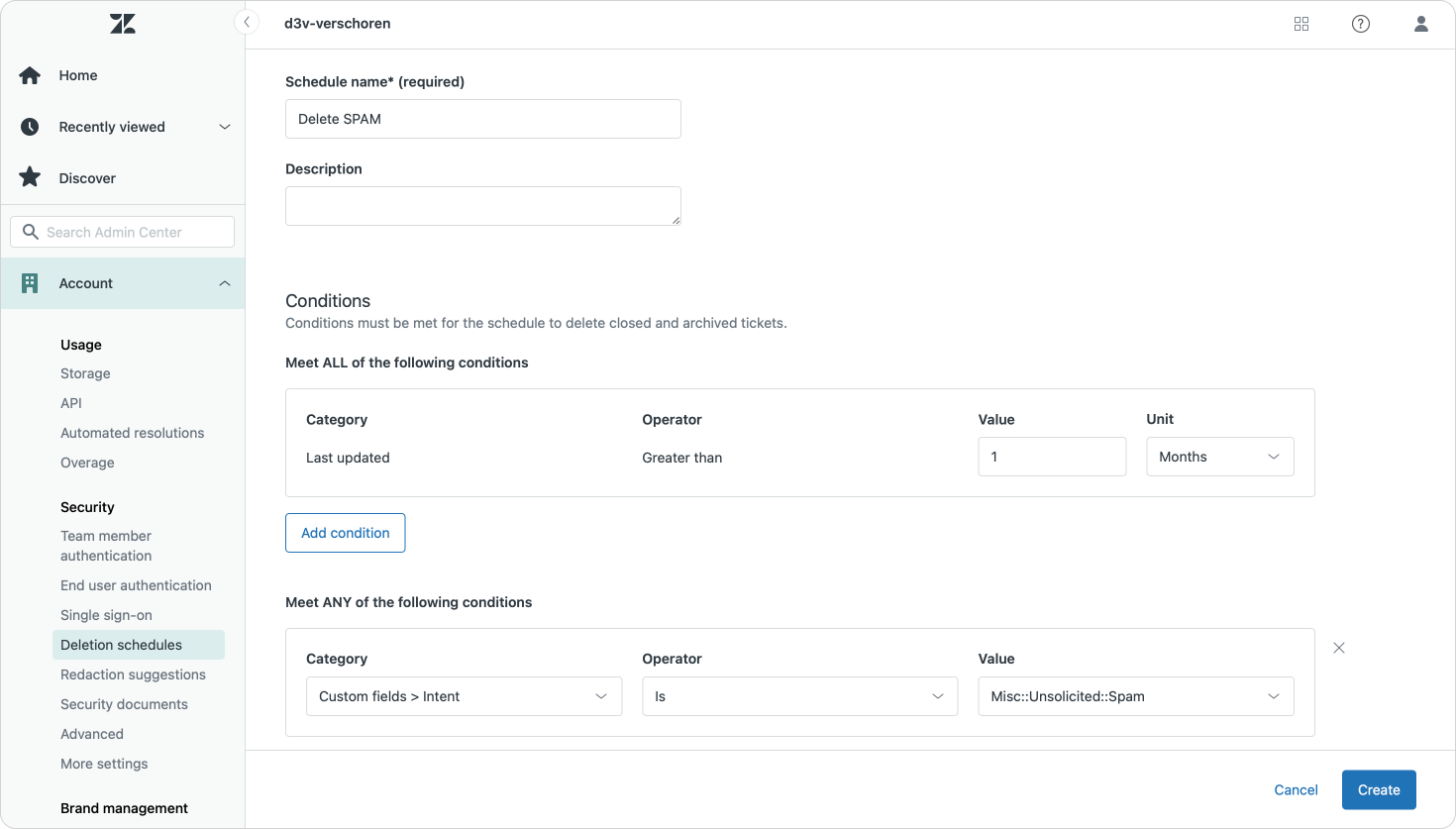 This allows you to create a deletion rule for all Support tickets after three years. Tickets for Finance get deleted after five years. And another rule set selects all tickets with a SPAM intent or categorization after 3 months.