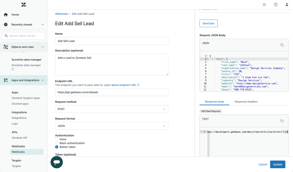 -d '{ "data": { "first_name": "Mark", "last_name": "Johnson", "organization_name": "Design Services Company", ... } }'However, note the Content-Type: application/json line. When trying to contact Sell via a Webhook the test mode gives the following error: