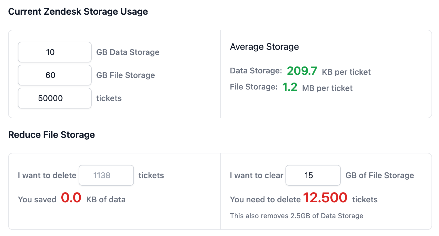 Take the example above. We know we have 50.000 tickets, and our File Usage is 60GB. This means that, on average, we have 1.2MB of File Storage per ticket.
