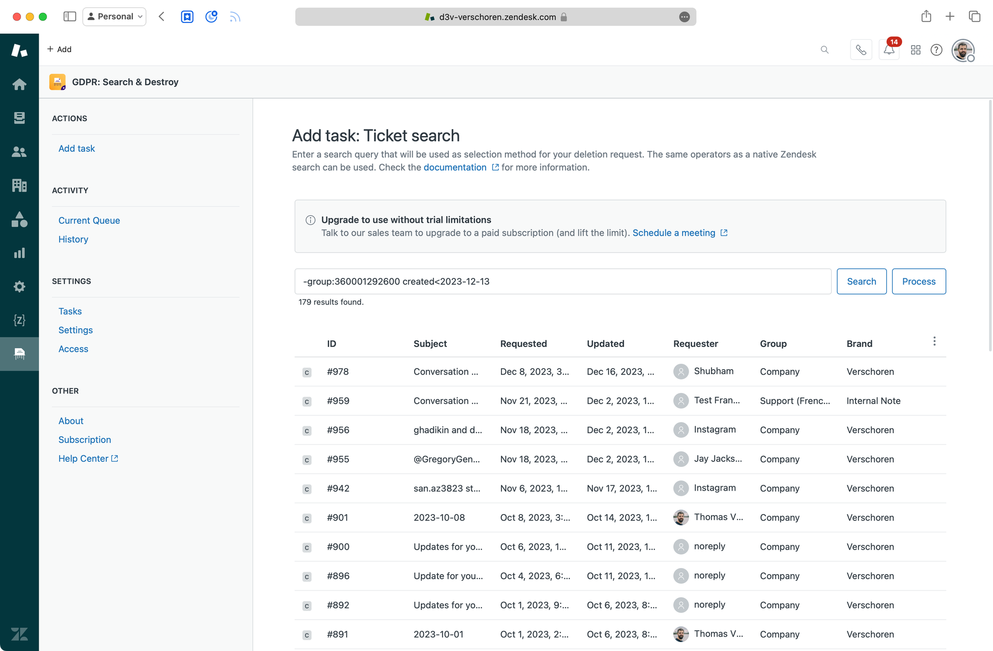 However, instead of writing the code yourself, we can also use an app like GDPR Search and Destroy by Zendesk Partner Sparkly to do this same search but without the additional coding work.