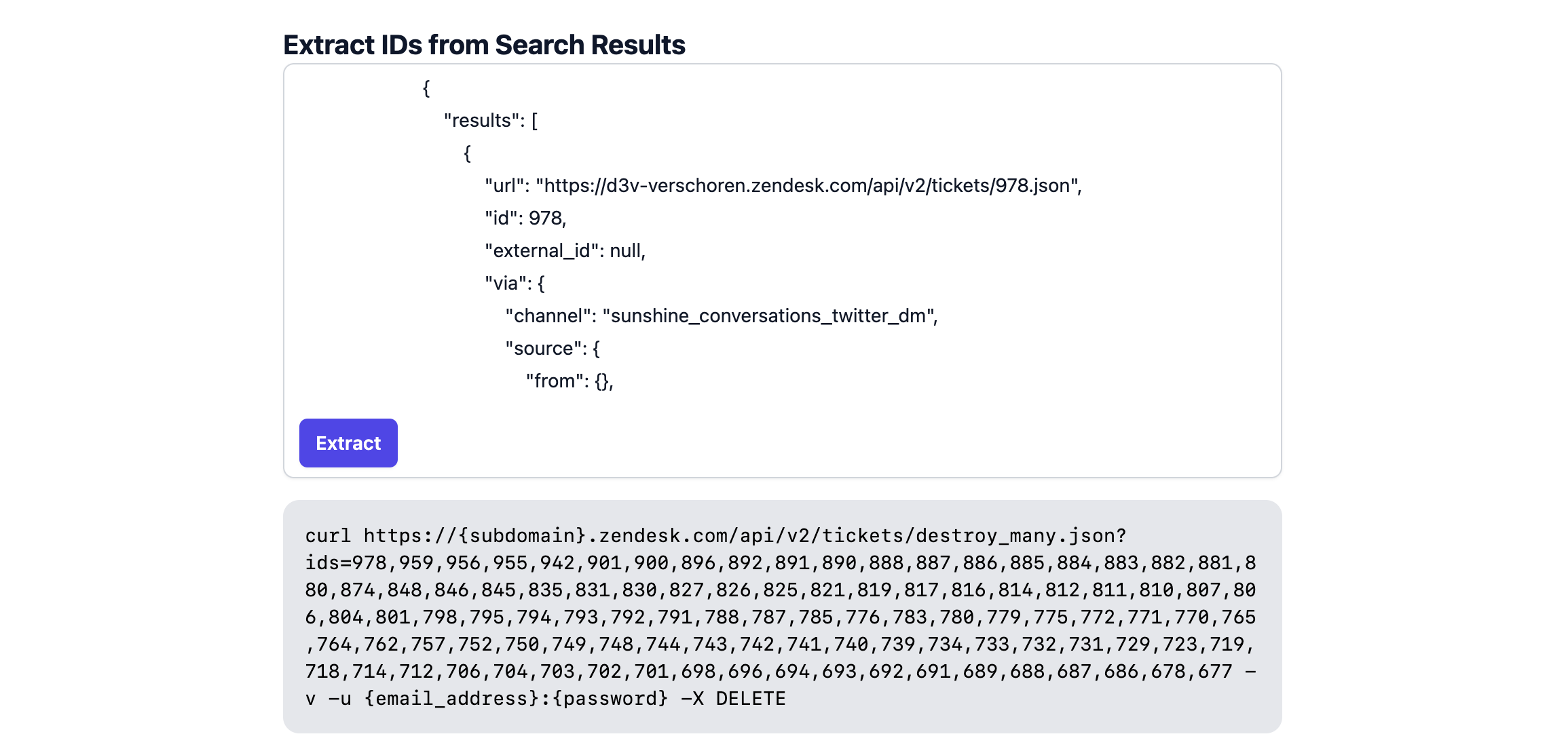 Or, if you prefer the API route, we can use the Bulk Delete Tickets endpoint, and delete our tickets per hundred via the following command: