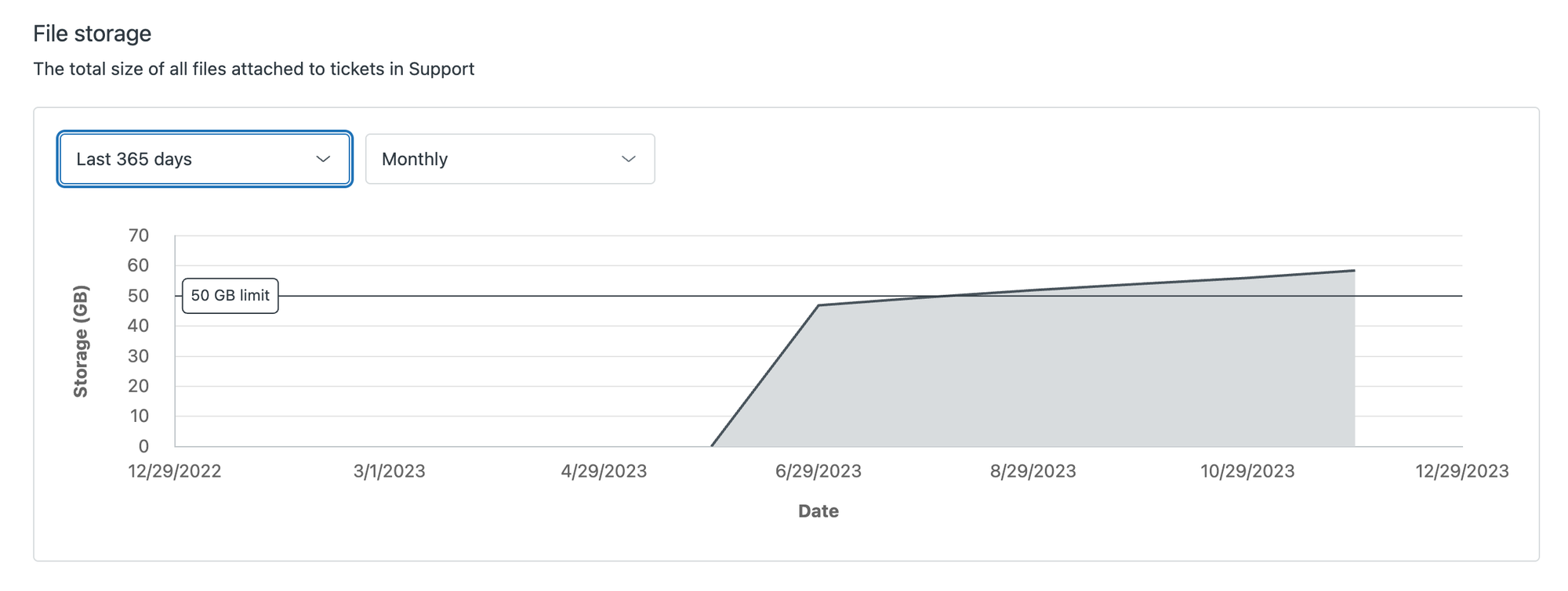 Zendesk has added a new Dashboard to the Admin Center to view your Storage usage. It gives you a high level overview of your current usage, and a timeline on how the data usage evolved over time.