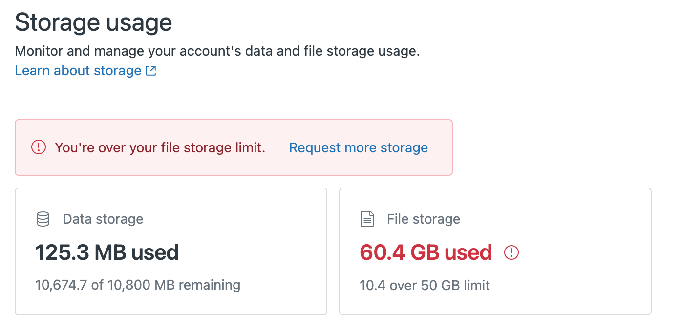The screenshot below shows the basic overview of storage usage in an instance that went over its File Storage: