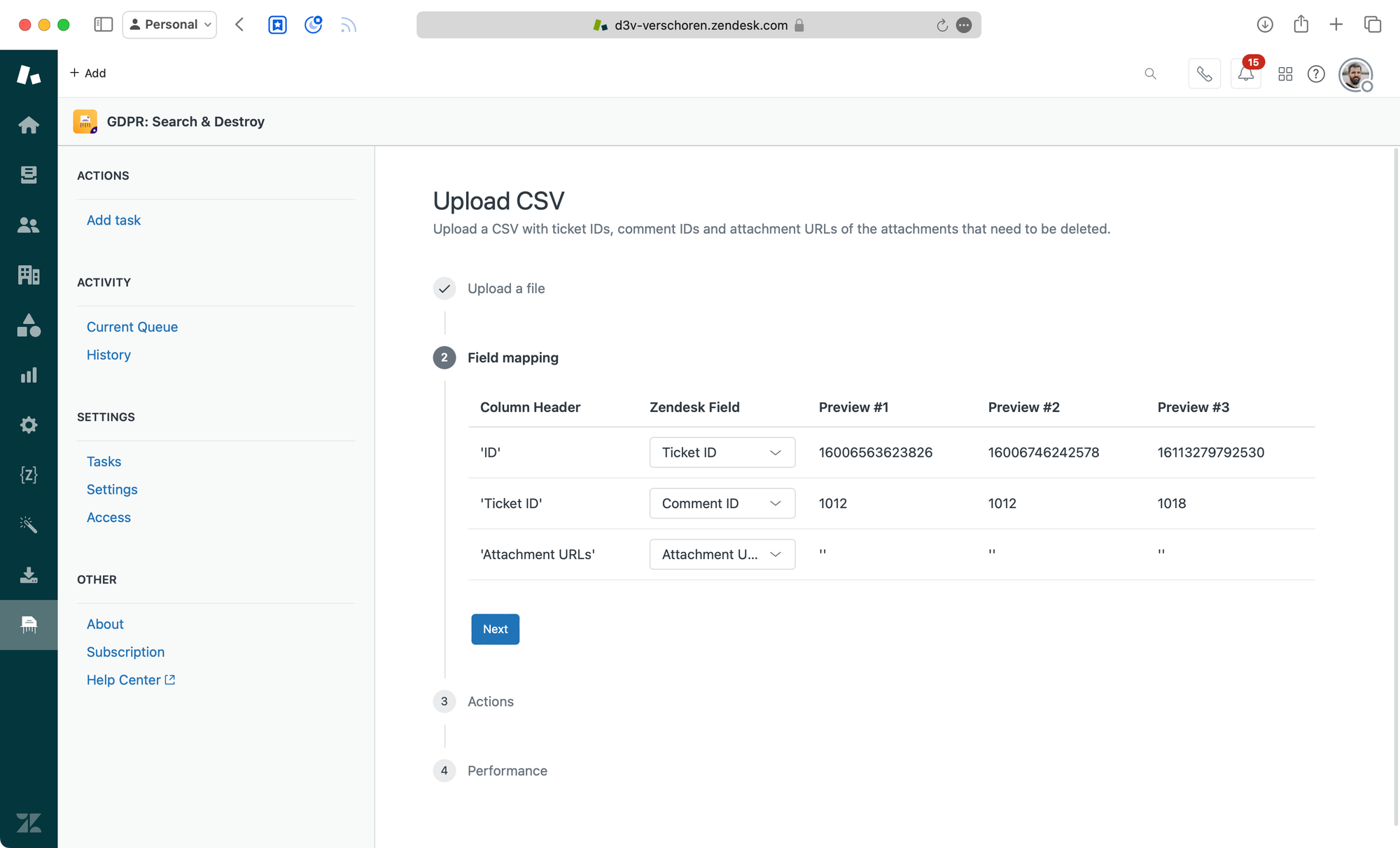 The app does require you to upload a list of IDs, so we still need to export all comments for the 12.500 tickets and create a matching CSV file first.