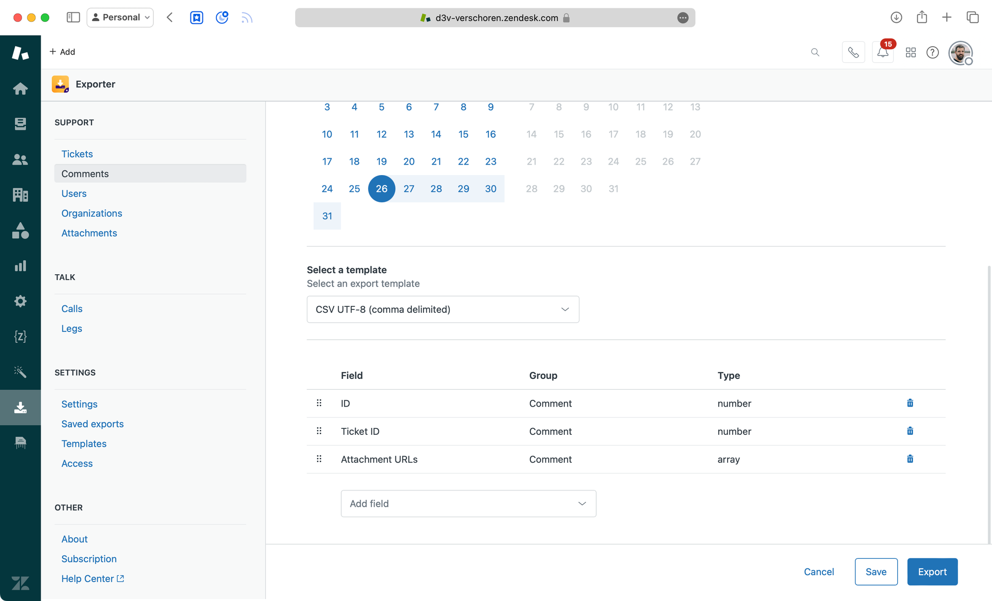 We could do this via API, or use the Exporter app (Enterprise license or trial required). This application has a Comments export feature we can use to generate a list of comments and their attachments. When exporting, select CSV (Semi-Colon) as the export type, and make sure you select the ID, Ticket ID and Attachments URLs fields.