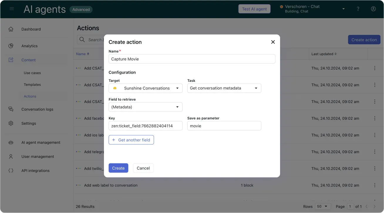 - If a ticket with a Refund intent is created, an Action Builder workflow could evaluate eligibility and alert the agent with an internal comment such as, “This is the sixth refund for this customer this week.”