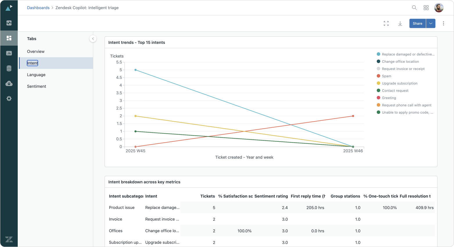 Zendesk's platform can help with identifying intent with its AI powered reporting. We can use the Intelligent Triage dashboard in Analytics to see which intents are detected the most, and decide based on those how we handle them. Combining this metric with a report that links them to average handling time, comments per ticket or similar metrics will help you identify what are the most "costly" interactions, or which interactions require only a single response to resolve. Where those one-touch-tickets are prime candidates for support articles, those more complex interactions can be turned into procedures where some of the steps are automated for the agent (Agent Copilot), or even the entire process is moved away from them (AI Agent).