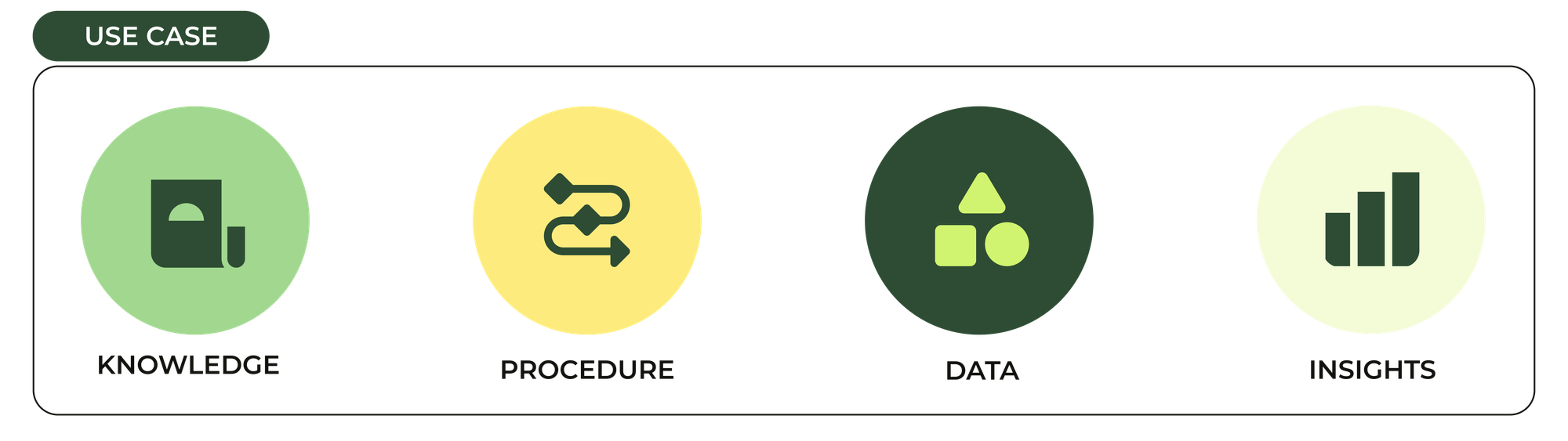 That's where use cases come into play. For each intent we need to decide how we are going to resolve that question. As we noted earlier, that can be done by any combination of four elements: knowledge, procedures, data, and insights.
