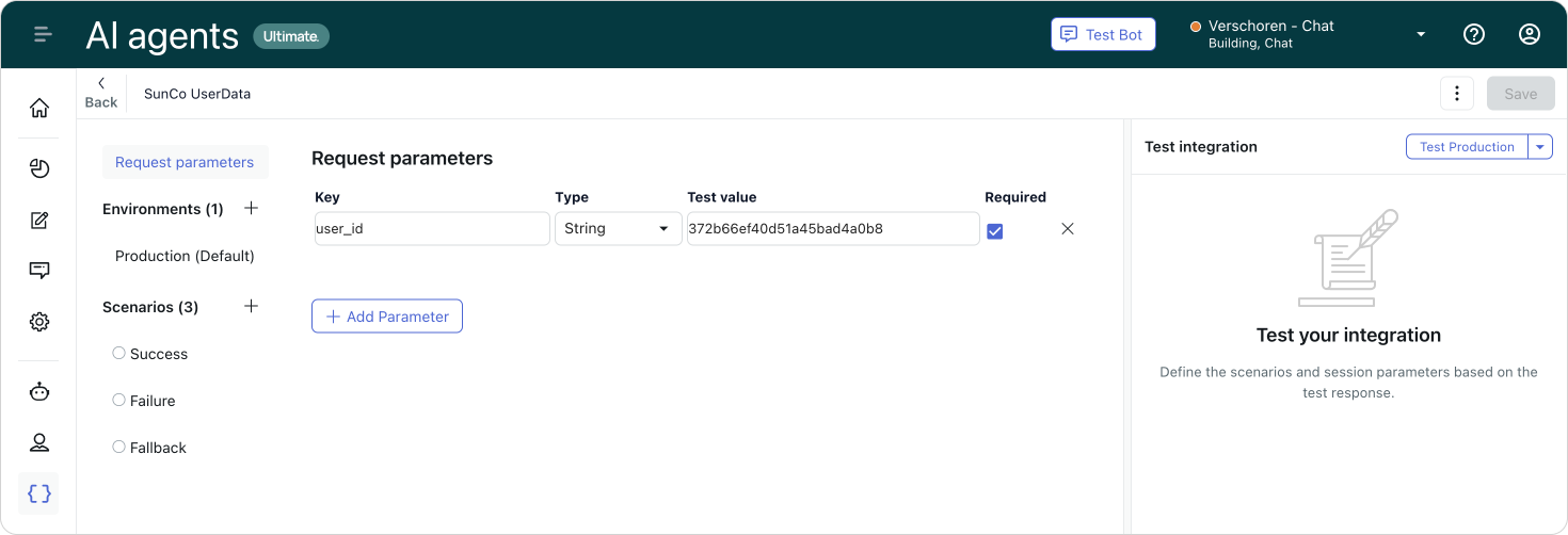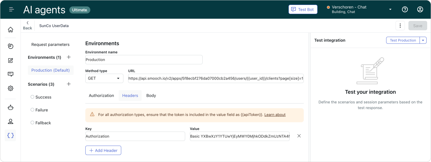 In the Request parameters section we need to define what variables we need in our API call. Since we're calling https://api.smooch.io/v2/apps/{{app_id}}/users/{{user_id}}/clients we need to set our user_id variable. Set the test value to the user_id we copied in the previous step, and set the type to string.