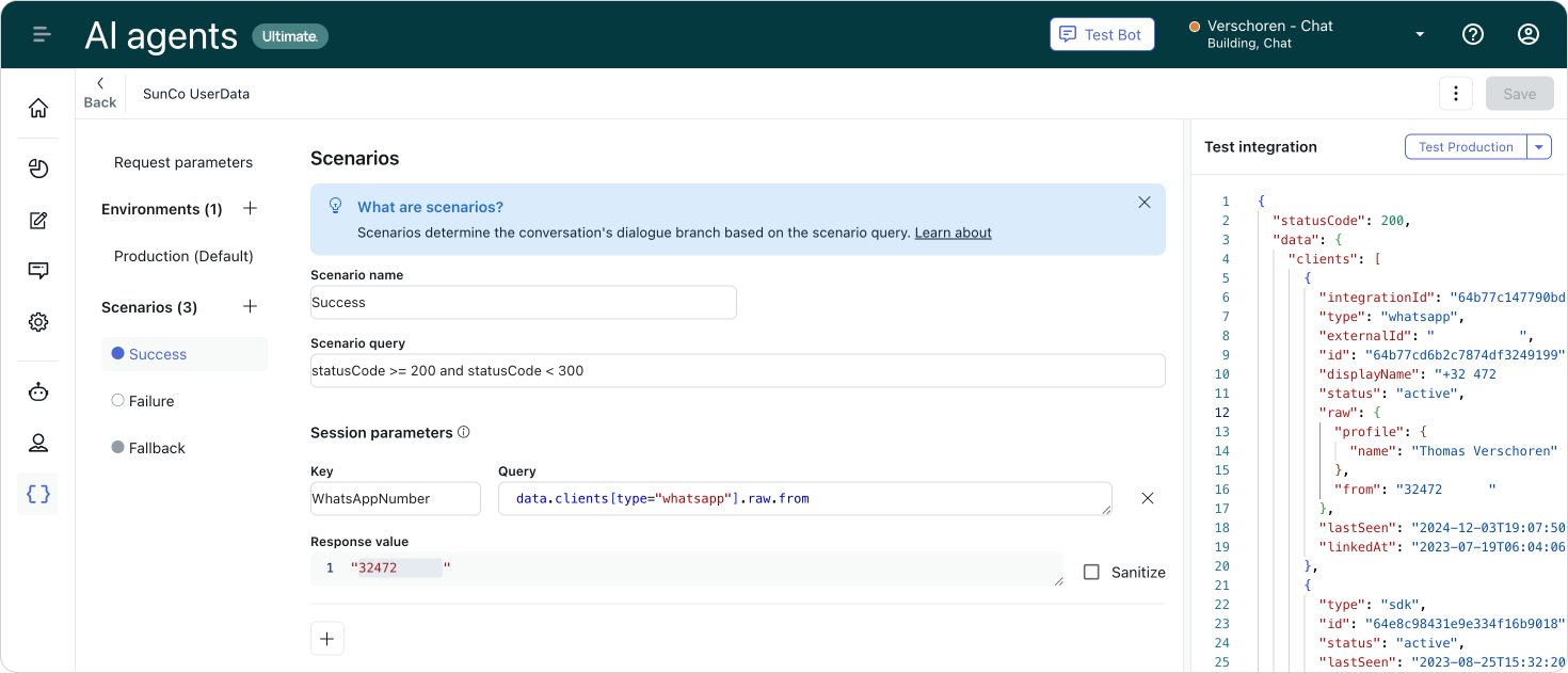 Since the WhatsAppNumber variable is set on the conversation level, I can now make subsequent API calls that use that variable as its input to retrieve user information from my CRM, or I can use the {{WhatsAppNumber}} syntax to print out the number in a Bot message.