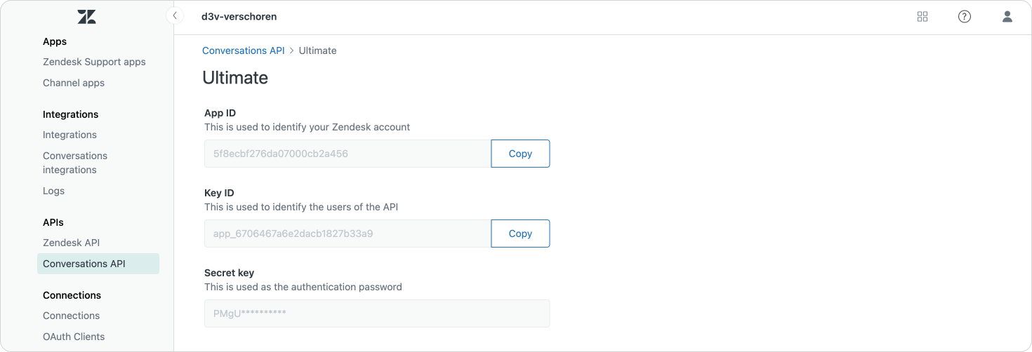 Before we move forward we do need to grab Sunshine Conversations credentials from our Zendesk instance. You can do this via the Admin Panel > Apps and Integrations > Conversations API. Copy down the App ID, Key ID and Secret Key.