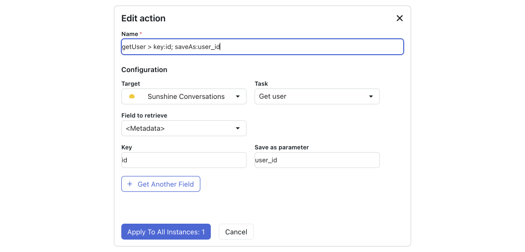 This is done via Content > Actions > Create Action. Select the Sunshine Conversations target, and the Get User task. retrieve the <metadata> field and store the id key as user_id