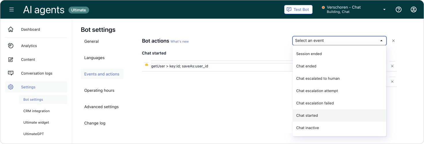 Doing so is done via Bot Settings > Events and Actions. Select Chat started in the event picker top right, and choose our action from the options that appear in the dropdown.