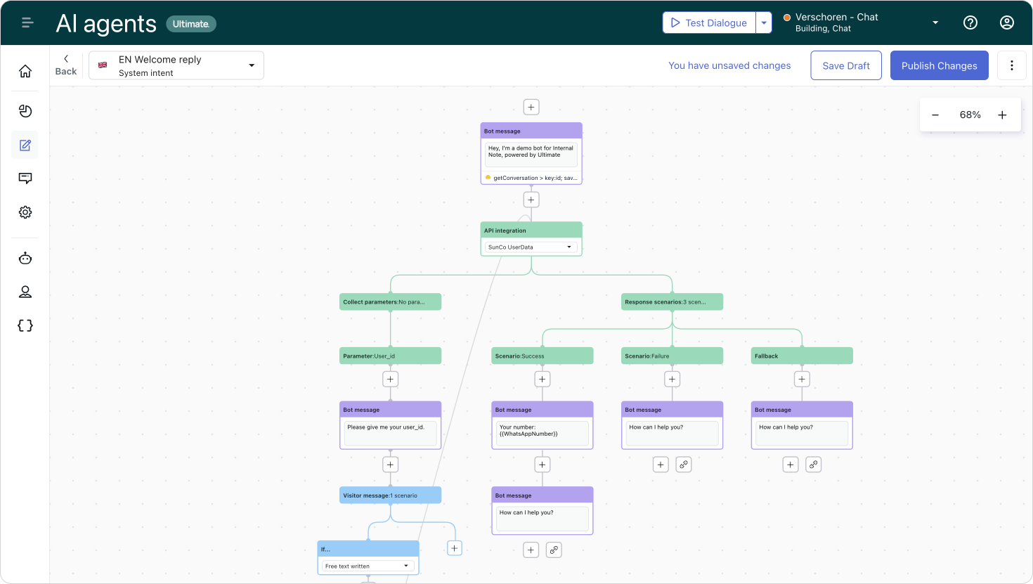 Now that we have our API call setup we can use this in flows. This is done by creating a new reply (or editing an existing one) and adding an API integration block to the conversation. This will create a lot of different branches in your conversation flow, but the important one is the Success branch. This is where the API successfully retrieved a phone number for the user.