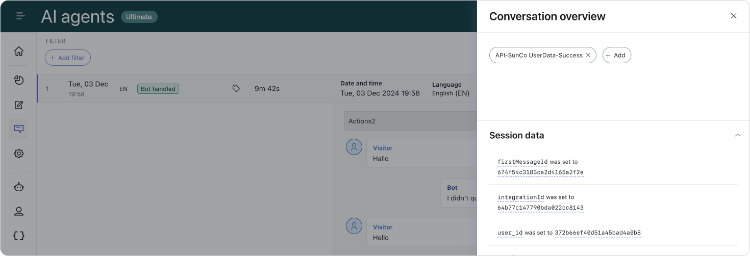 This data is accessible in Ultimate via actions. They allow you to grab information from the SunCo objects and store them as variables usable in conversations, conditional flows or API calls.