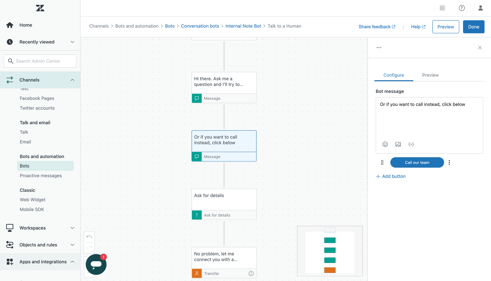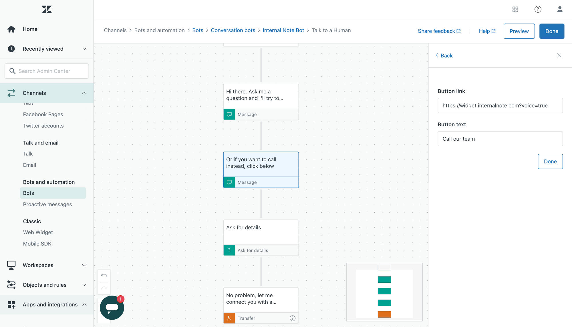 One of the limitations of the Voice via Messaging feature is its lack of integration with the Zendesk Bot. Where the Classic Widget had a contactOptions feature which listed chat, forms and voice as options in a list, the current bot misses this feature.