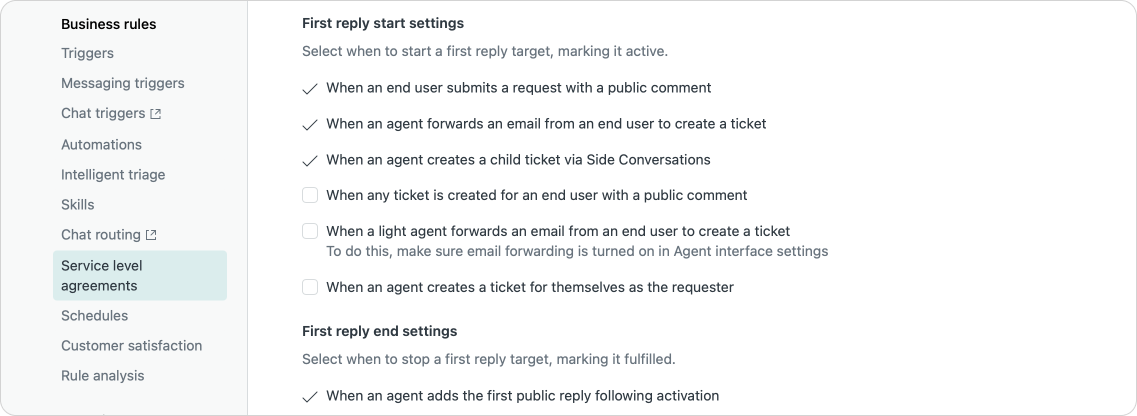 Aside from starting the FRT counter when an end-user creates a ticket, by default Zendesk will also start the counter when an agent forwards an end-user email to Zendesk, or when a new Child Ticket via Side conversation has been added.