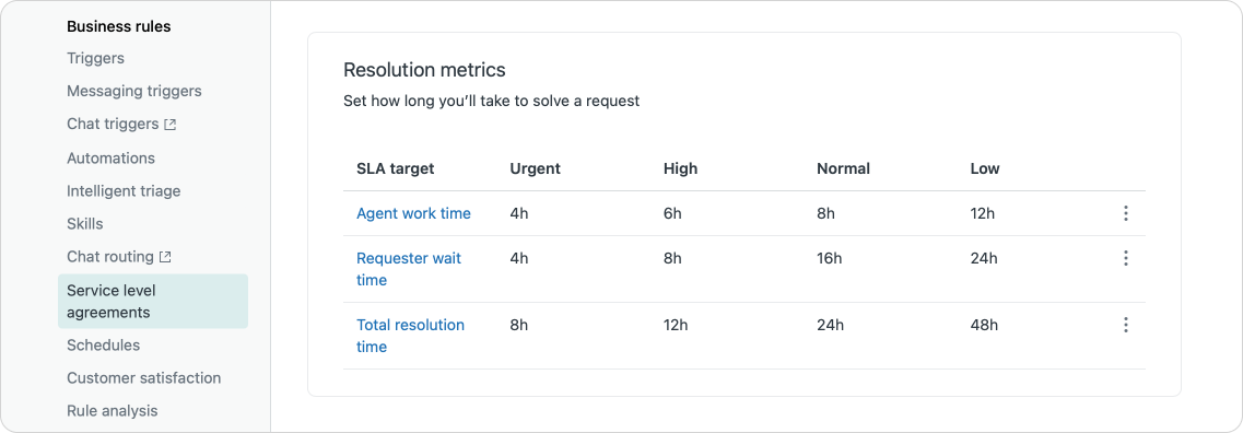 - Target Metrics are the actual core of your SLA setup, they define what time you want to measure and report on. Each metric can be defined for each of the four priorities: low, normal, high, urgent. You can define those metrics in Calendar or Business hours. Personally I prefer business hours since you can only control what you do while your team is working, but customers might count in calendar time (I submitted this on Friday and you replied on Monday, I've been waiting for 4 days!) so you might choose to do your setup based on Calendar hours.