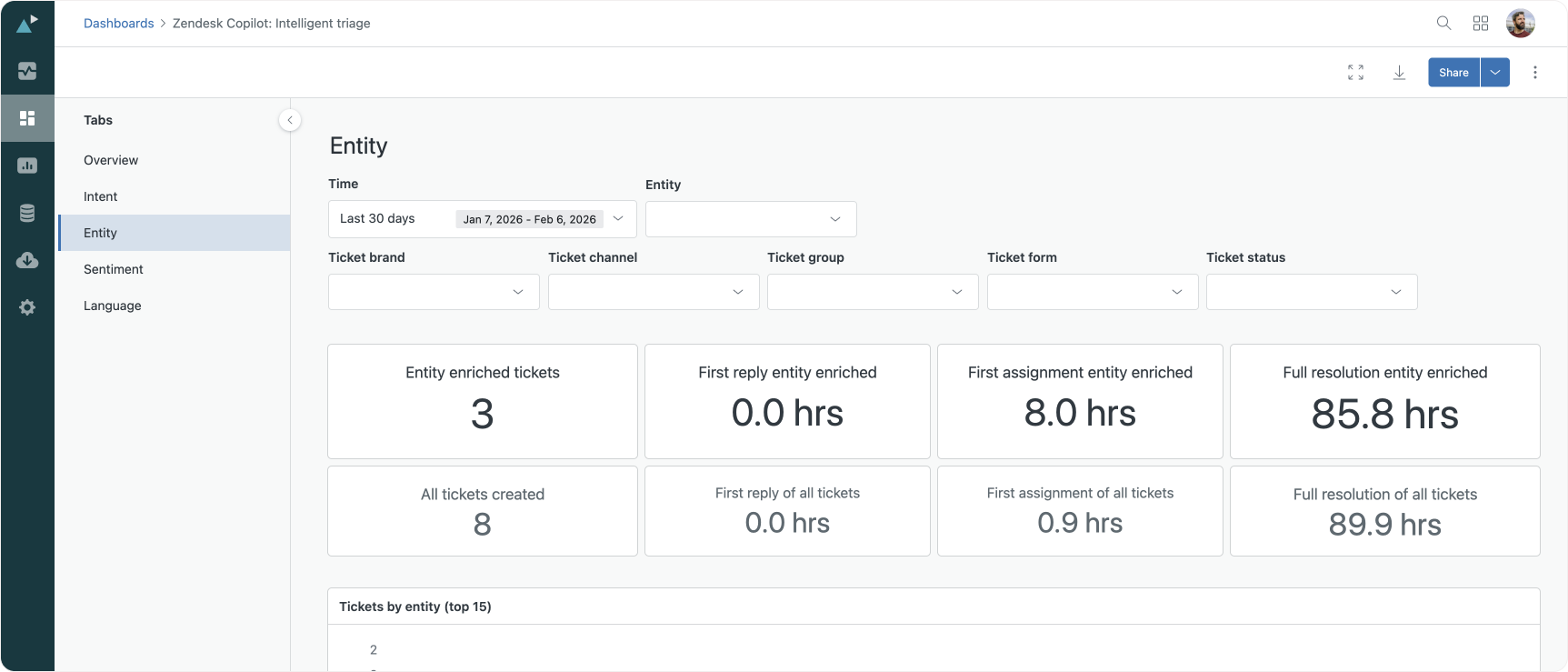 Secondly, there's an expansion to the Intelligent Triage dashboard, which now also includes support for Entities on top of the existing Intent, Sentiment and Language dashboards. And since entities are also available within custom fields, you can also use them to report on e.g. the amount of questions about Desktops vs Laptops.