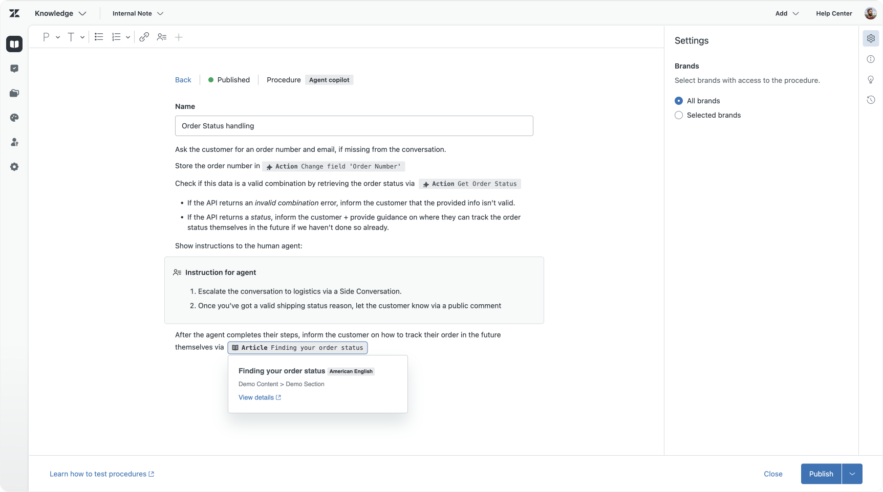 Procedures contain both logical steps, instructions for your team, as well as actions Agent Copilot can take. As noted above, they can get and set Zendesk ticket data, they can call external APIs via custom actions, and they can invoke action builder workflows and macros.