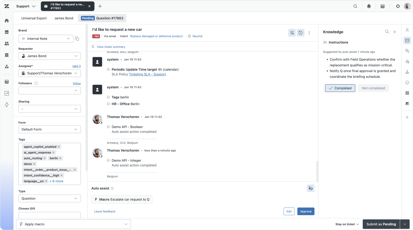 They can update the ticket's fields and status, or run existing macros in your instance. And naturally, they can generate suggested replies for the agents to accept based on all this information.