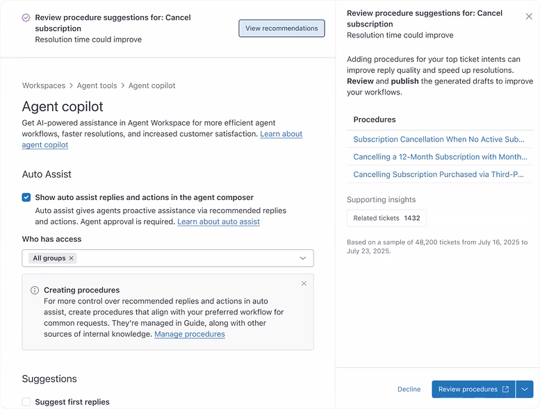 And now, you'll start seeing Procedure recommendations in Admin Center too. These recommendations will contain drafts of new procedures, based on detected patterns in your recent tickets.