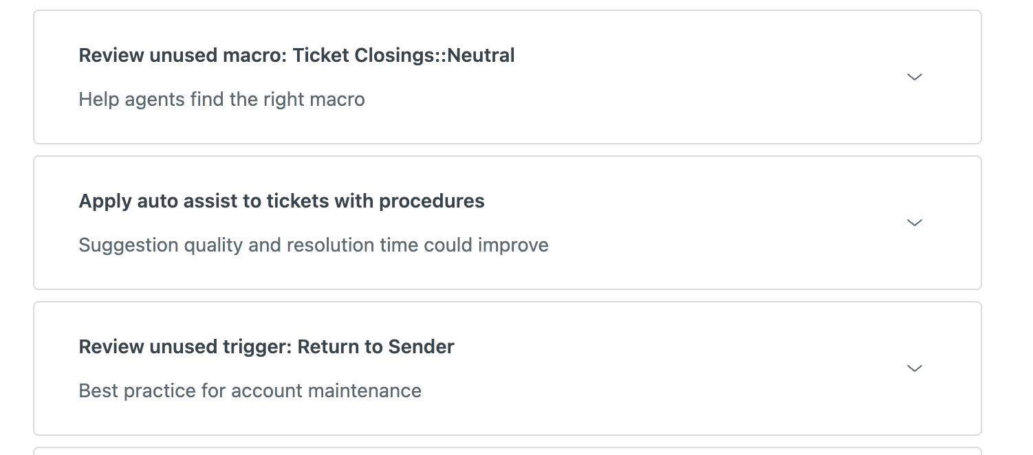 It offers suggestions for triggers to disable or modify, new auto-assist procedures, intent suggestions, or improvements you can make to your routing setup. These recommendations are based on your Zendesk's ticket data, and can react to spikes or falls in specific ticket types, as well as best practices and new features Zendesk adds to the platform which, once enabled, can further improve your setup.