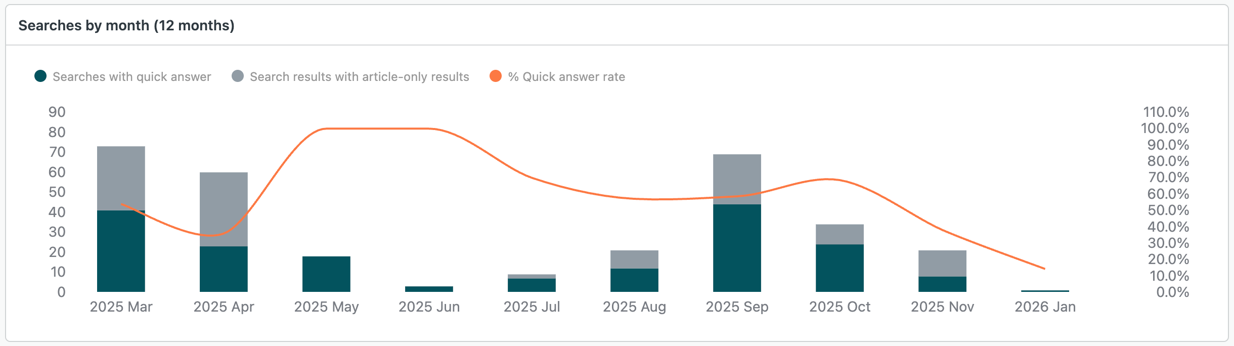 First off is a new Quick Answers tab in the Knowledge report. This allows you to measure the performance of these generated answers within your Help Center's search tab.
