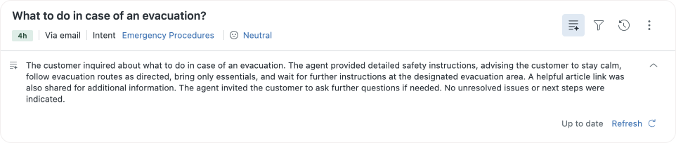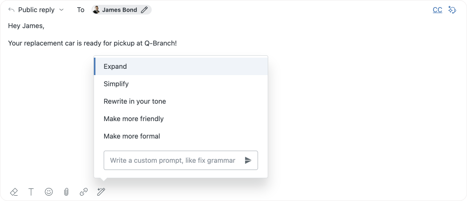 Even without using any of your knowledge or procedures, writing tools help your agents with writing reactions. They can shift a message's tone from casual to professional. They can shorten a lengthy comment, or they can turn a few short lines into a longer, more friendly reaction. Or they can use custom prompts to write, translate and transform their comments.