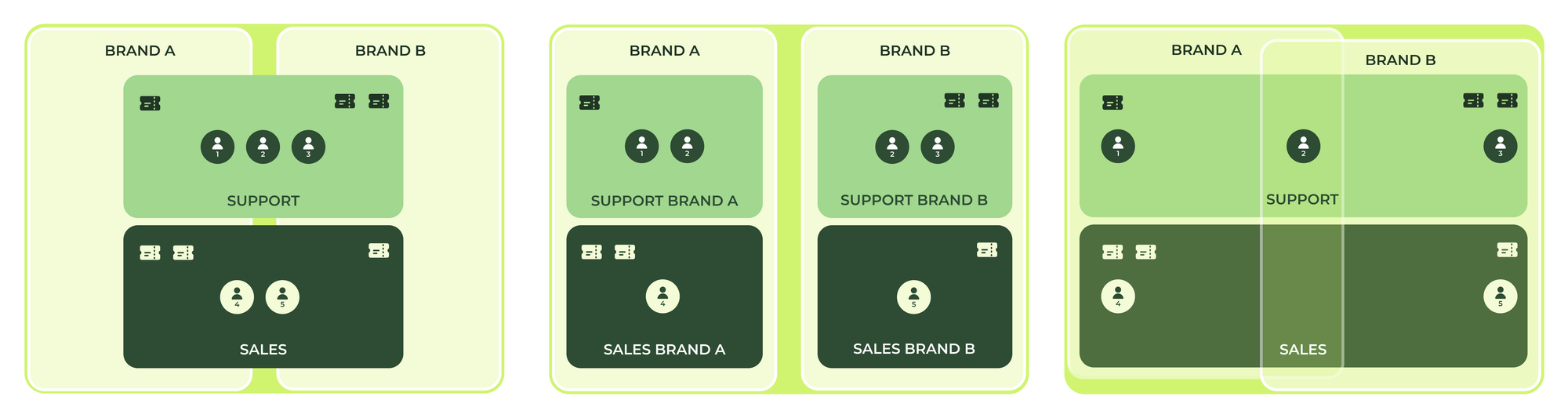 The middle image shows a more nuanced approach were each brand has their own support and sales group. This makes sure the support agents that handle brand A can never see tickets for brand B. While this setup works, agents can only access their own brand's tickets, it's a more complex setup. Agents live in multiple groups, and setting up queues, assignment triggers or SLA's all need to be done double, once for each brand.