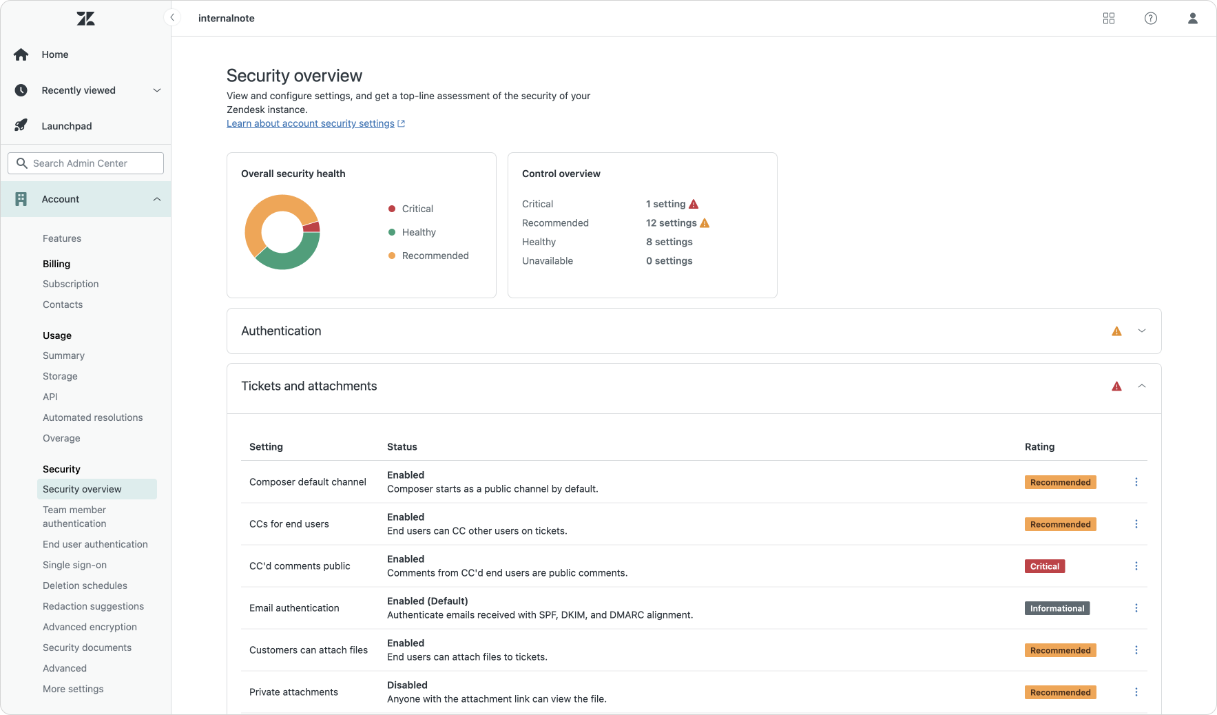 One of the bigger initiatives Zendesk took this past year is the release of the new Security Overview dashboard in the Admin Center. This new dashboard gives you a health score and overview on how you're handling security in your instance.