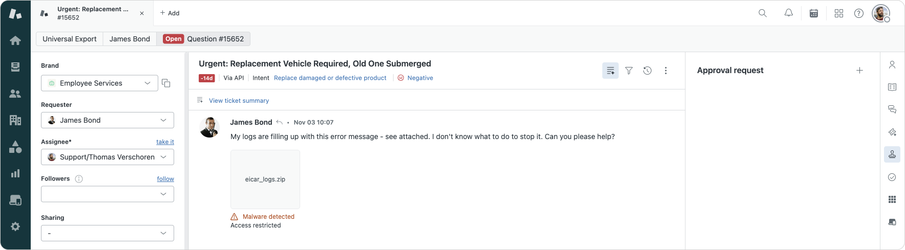 Since attachments come from unknown sources, Zendesk has scanning in place that looks for malicious attachments with known malware. For now that scanning excludes attachments upload by customers via Messaging, but all other channels are included. By default these attachments can not be accessed by agents, but you could expand their role to allow them to download these attachments.