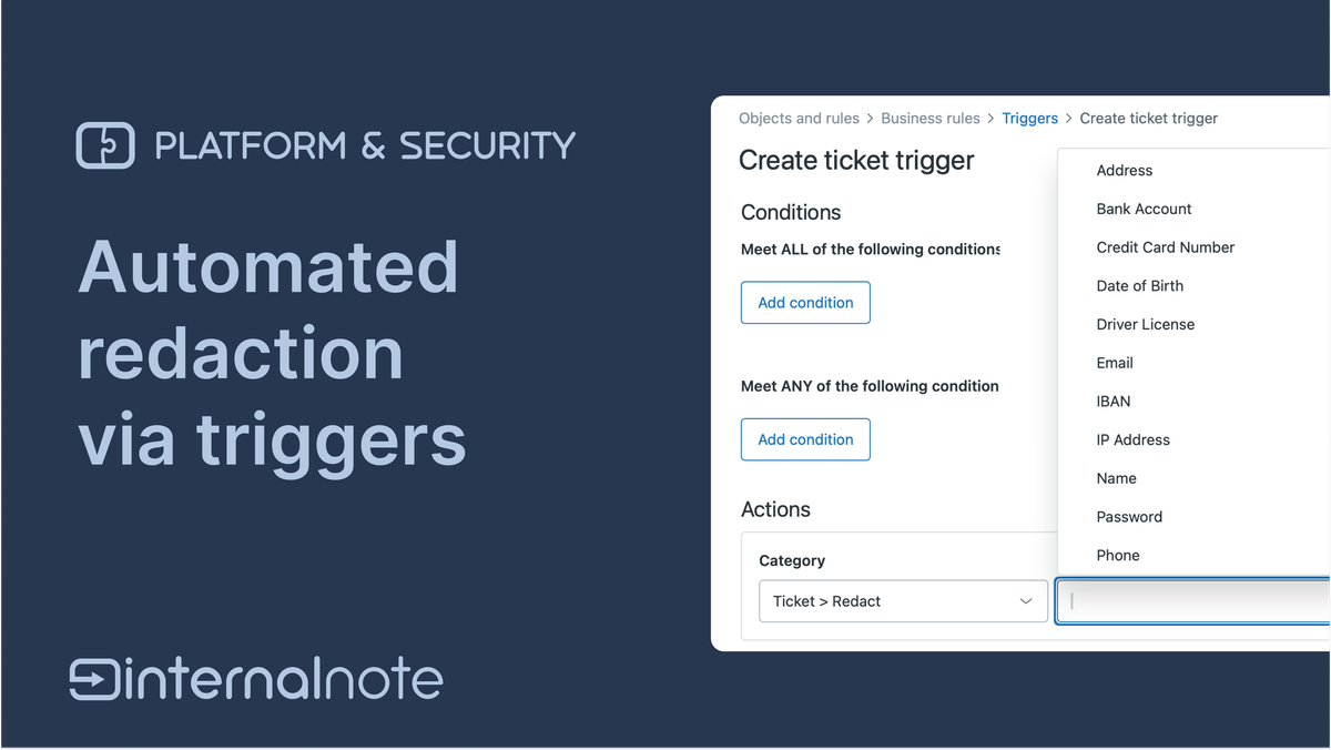 You can create triggers that automatically redact specific information either at a ticket's resolution, or when specific conditions are met like "user verified checkbox is checked". Or in the case of SSN and credit card numbers, we could redact these elements upon ticket creation, making sure that data is removed before a ticket gets assigned to an agent.
