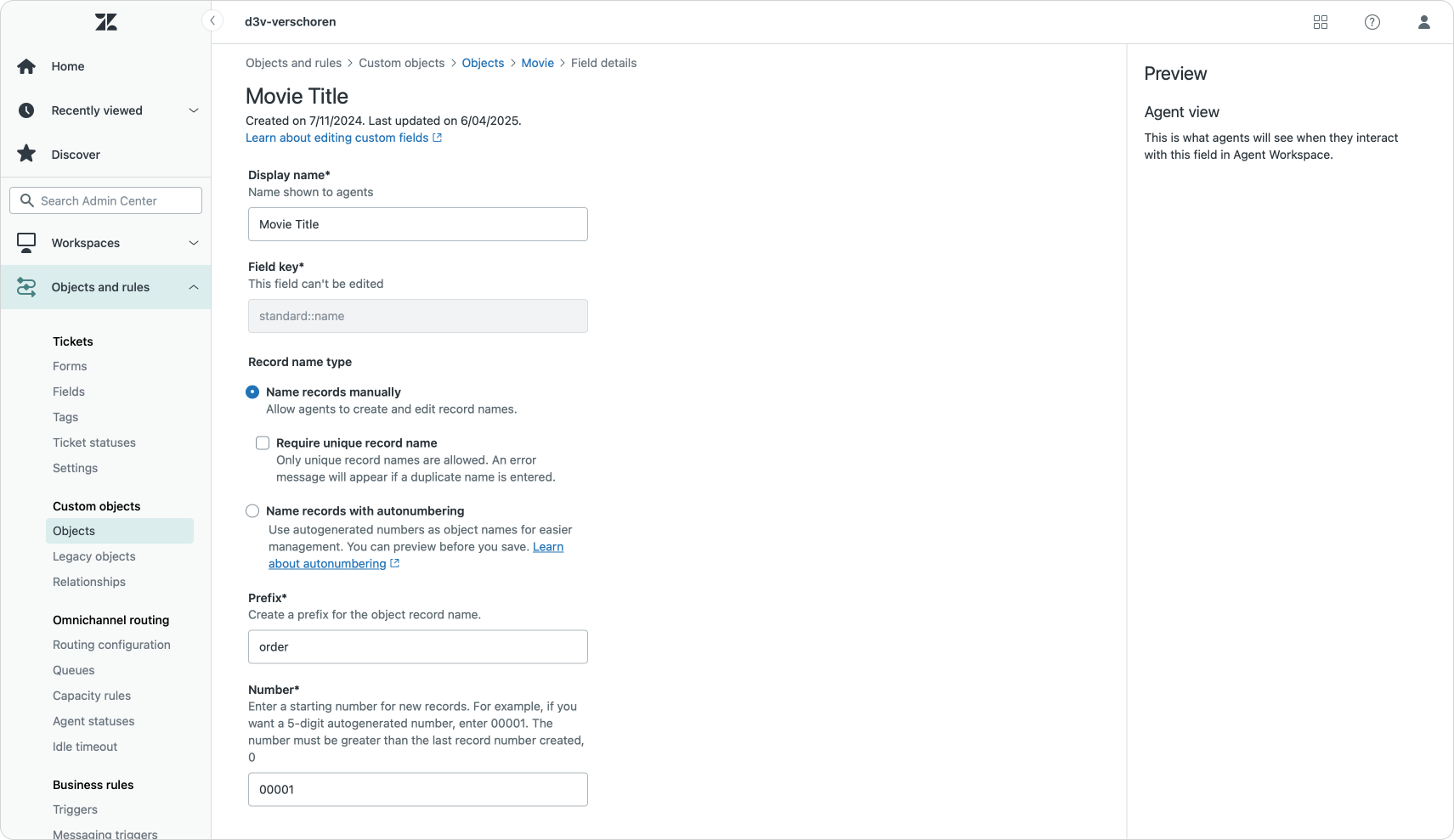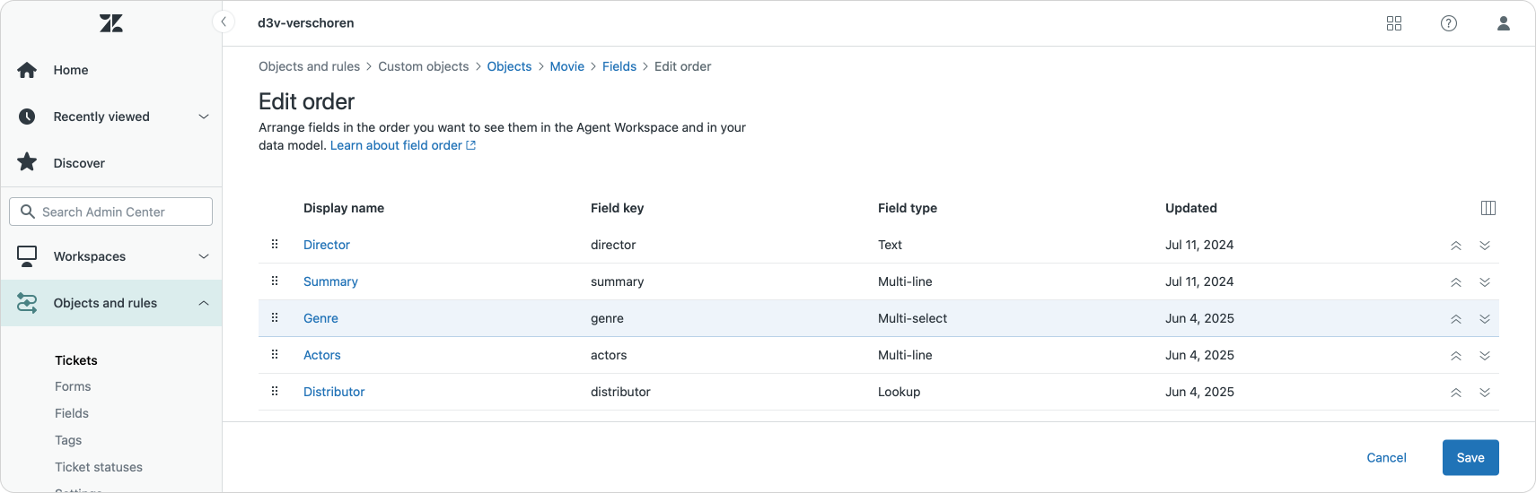 It's now possible to change the order of the fields in the Custom objects, which will impact the overview of records in the Agent Workspace. The first three ticket fields will shown up as columns in the overview, giving Agents a relevant overview of all objects in the list.