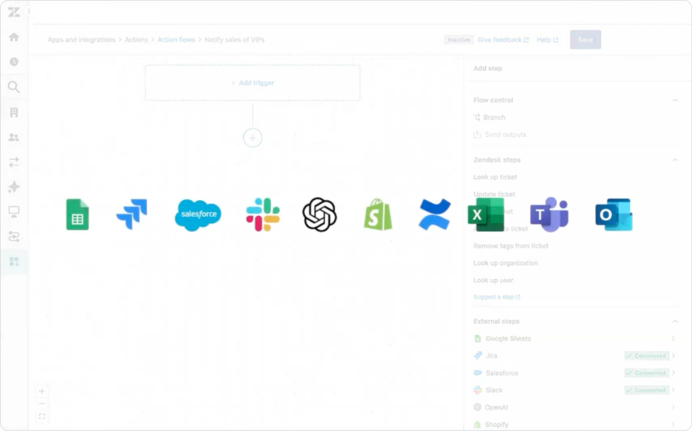 With Action Builder you can notify a specific Slack group if a VIP user contacts you. Or create a ticket in Jira, update or look up data in Salesforce, Shopify or plenty of other popular and built-in integrations.