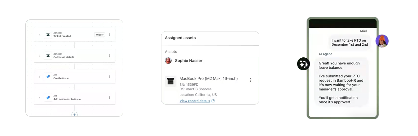 Processes don't end with your CX team though. Finance might need to handle complex refunds. Marketing or Development needs to be pulled in. Logistics might need to check a delivery. For those parts of the process that live outside of customer care, Action Builder allows you to integrate your wider company into Zendesk, and Knowledge Connectors expand the knowledge graph with data from tools like SharePoint or Confluence.