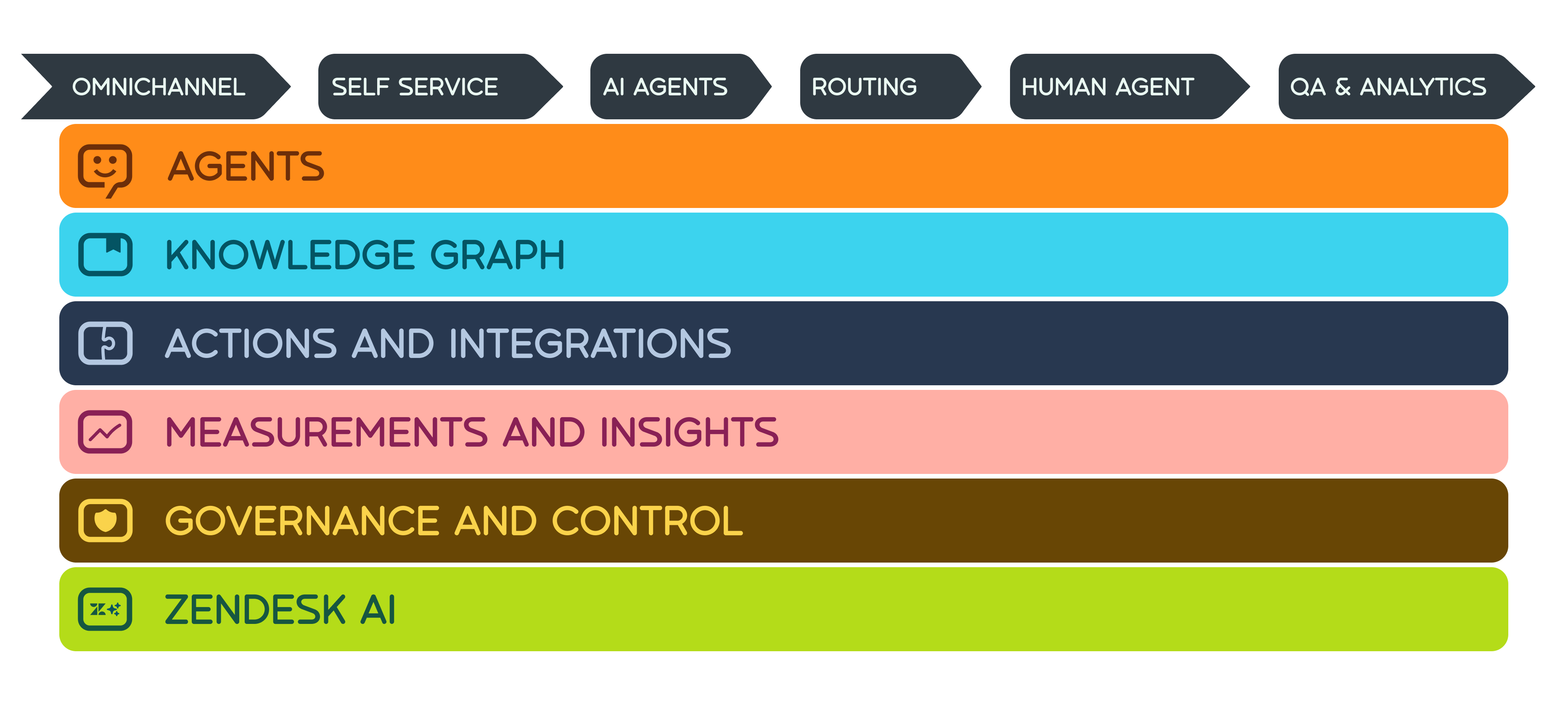 Regardless of what channel a customer chooses, at the topmost layer we still have a self-service approach, powered by your Help Center and AI Agents Essentials or Advanced. They pull from your knowledge sources, integrate with other tools, and follow procedures to try to automate as much of the conversation as possible.