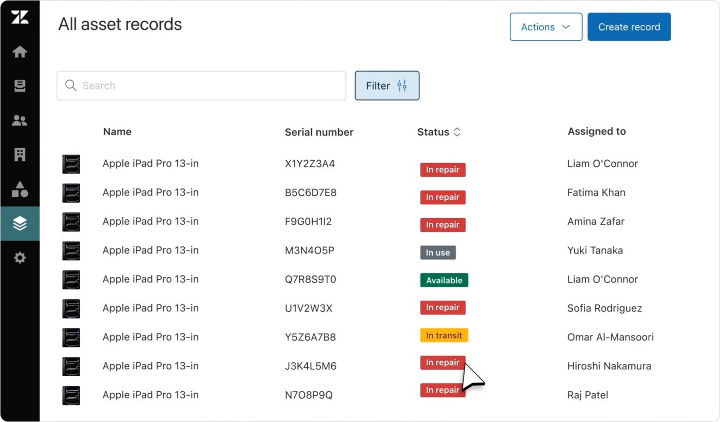 Each device can have custom fields storing device and assignment data. You can filter your assets, link them to users and tickets, and manage the entire device lifecycle from within Zendesk, deeply integrated with reporting and the service catalog.