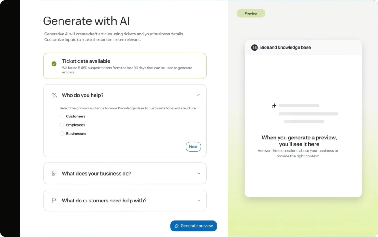 By shifting the workload from writing to validating and instructing—and pairing that with existing AI tools in the Help Center like tone shift, expand, or simplify—it suddenly becomes a lot easier to get knowledge out the door. You can spin up a Help Center faster, surface better answers sooner, and give agents back the time to focus on the requests that can’t be turned into articles.