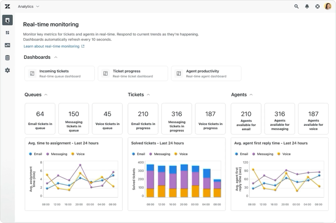 This new Analytics Home Screen shows your team live data on queue size, ticket backlog, agent capacity, with deep dives on each one of these. And since the data is live, these dashboards become actionable. A sudden spike in messaging tickets can be resolved by putting more agents online on that channel. Or a spike in payment failure intents might lead into an escalation and wake up call for your SysOps team.